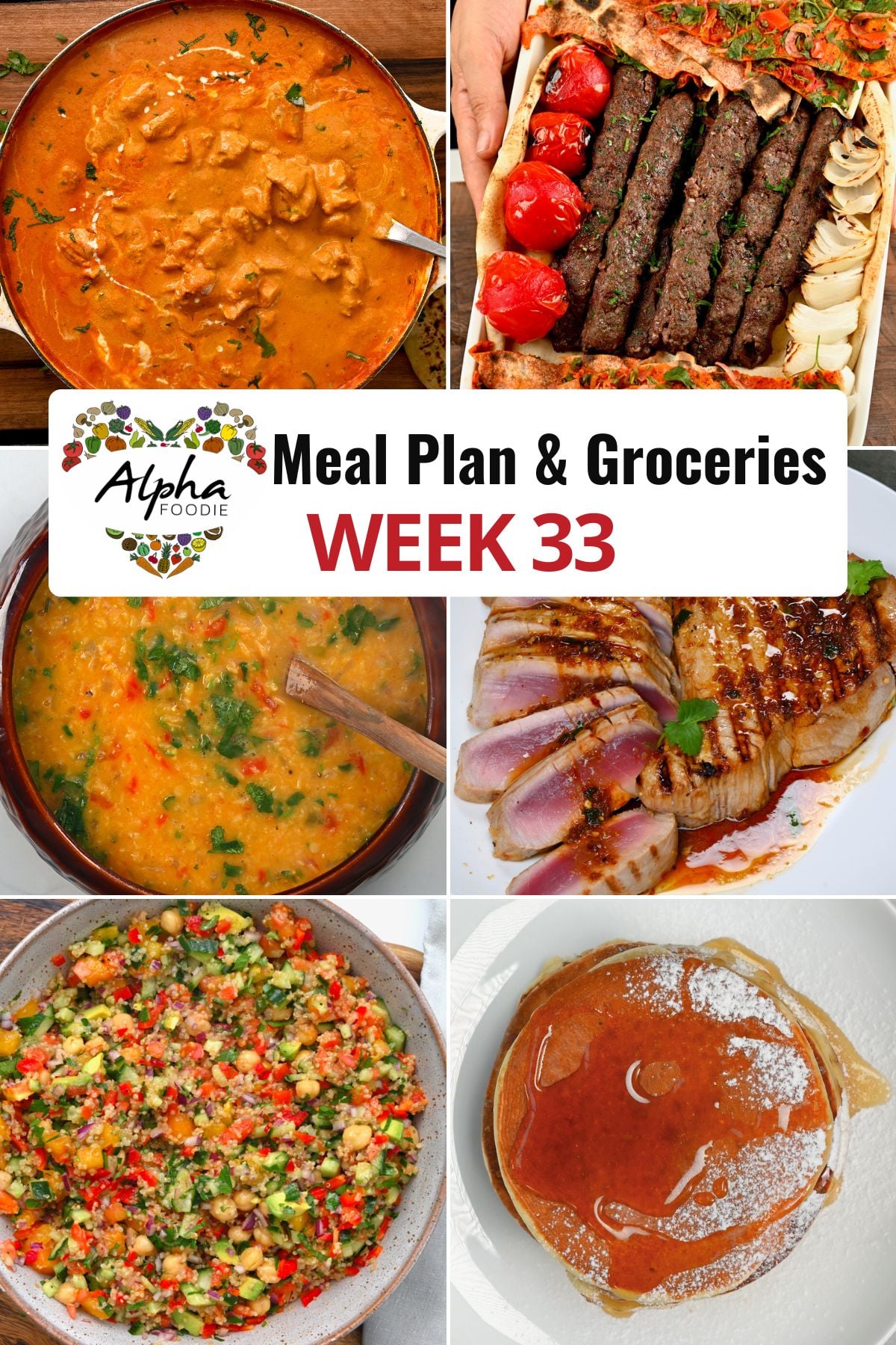 The plan for Week 33 features butter chicken, authentic kofta kebab, hearty red lentil dal, quick and easy grilled tuna steak, and a satisfying quinoa salad. Additionally, enjoy a bonus light and fluffy protein pancakes!