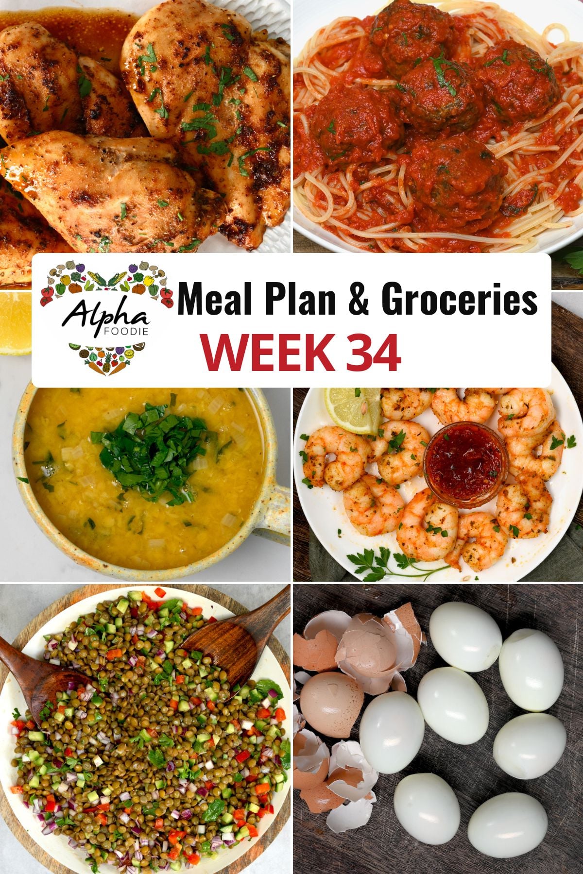 The plan for Week 34 features oven-baked chicken breast, Italian meatballs, Lebanese lentil soup, quick air fryer shrimp (so tender and juicy), and a satisfying lentil salad. Plus, a bonus: a simple, foolproof way to make perfectly peelable hard-boiled eggs with top tips.