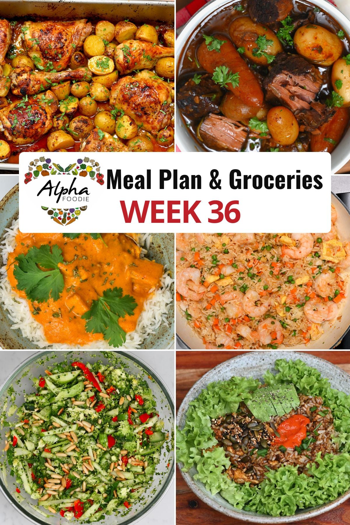 The plan for Week 36 features easy-to-prep one pan chicken and potatoes, easy slow cooker beef stew, vegetarian butter chicken (tofu butter chicken), quick and super simple shrimp fried rice, and easy broccoli apple salad. Additionally, a bonus breakfast fried rice using leftover rice.