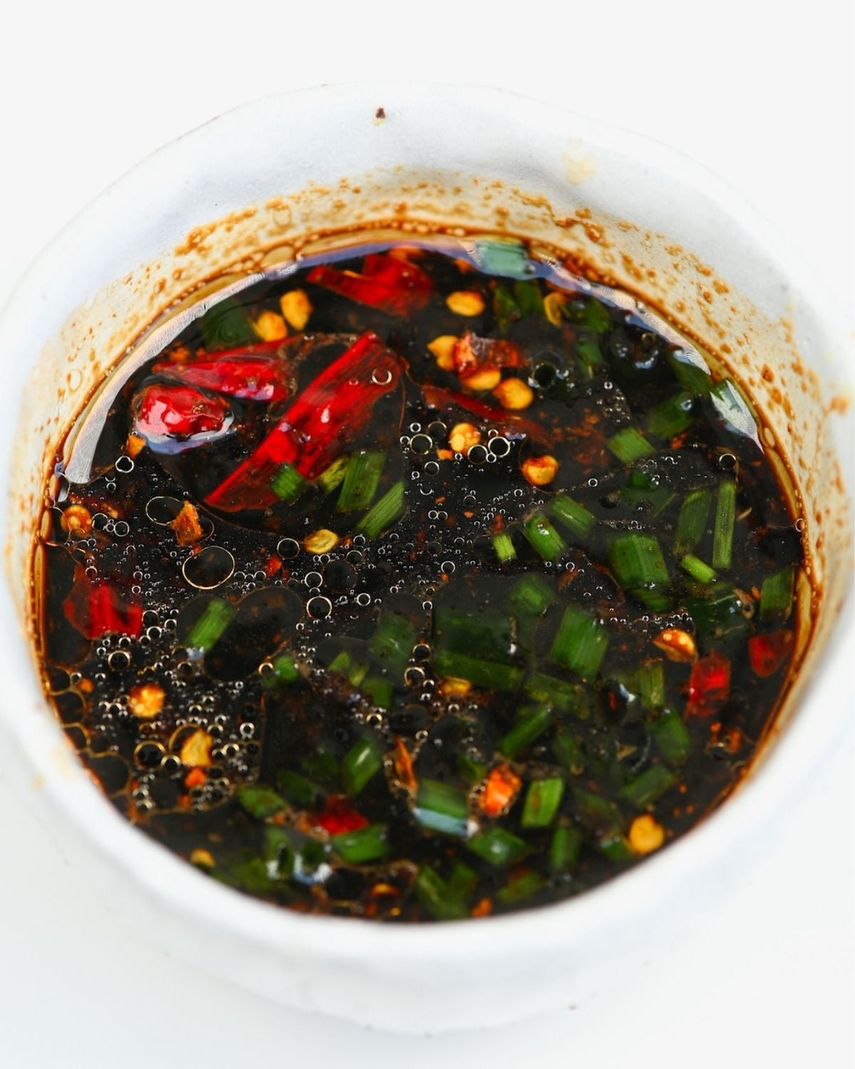 - Add soy sauce, rice vinegar, toasted sesame oil, garlic, and ginger. Add chili (if using). If using Chinese black vinegar, add a small splash. Stir well (or shake in a jar) until glossy and combined.
